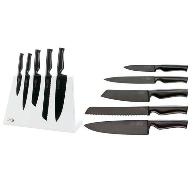 Лучшие цены. Материал лезвия: сталь молибден-ванадиевая (X55 Cr Mo V 14); Материал рукояти: нержавеющая сталь AISI 304; Материал подставки: бук; Твердость по шкале Роквелла: 55-58 Hrc; Тип заточки: двусторонняя симметричная; Угол заточки: 20°; Состав набора: нож для овощей, нож универсатльый, нож сантоку, нож для хлеба, поварской нож, подставка; Цвет: черный; Цвет подставки: белый; Серия: Virtu Black; Производство компании: IVO Cutelarias, Португалия.В коллекцию VIRTUBLACK входят идеально сконструированные кованые ножи. Магазины в вашем городе.