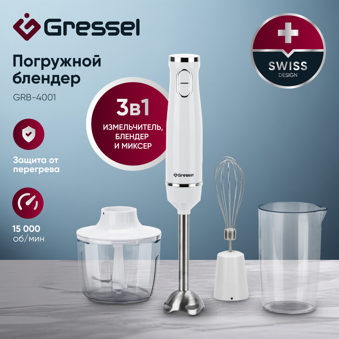 Миксеры и блендеры Погружной блендер Gressel GRB-4001, 3 насадки, 2 скорости, 800Вт, защита от перегрева, белый, профессиональны, ECO