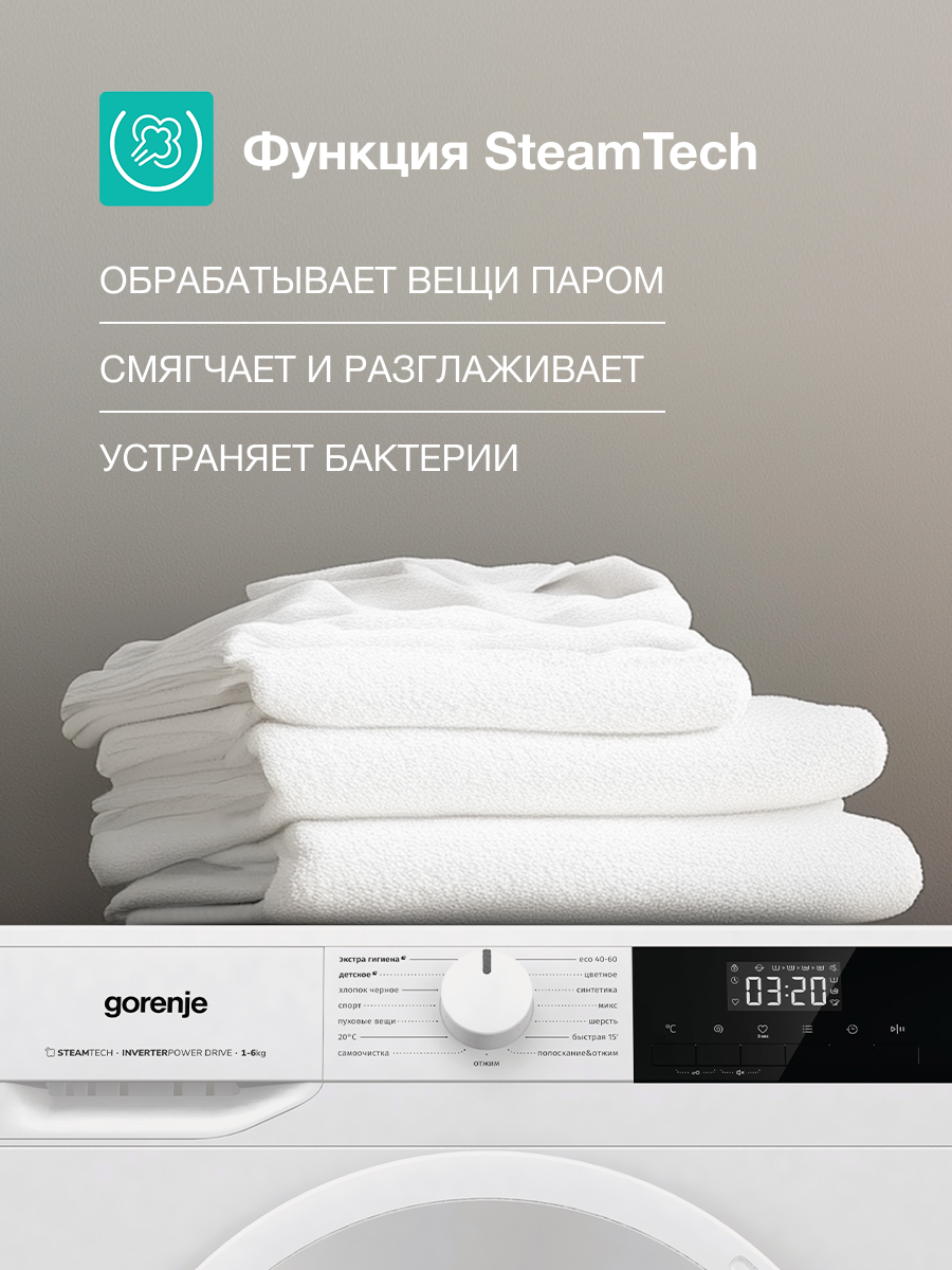 Стиральные машины Узкая стиральная машина Gorenje W1NHPI72SCS, класс А, 7 кг, 1200 об/мин, Инверторный мотор, самоочистка, белая