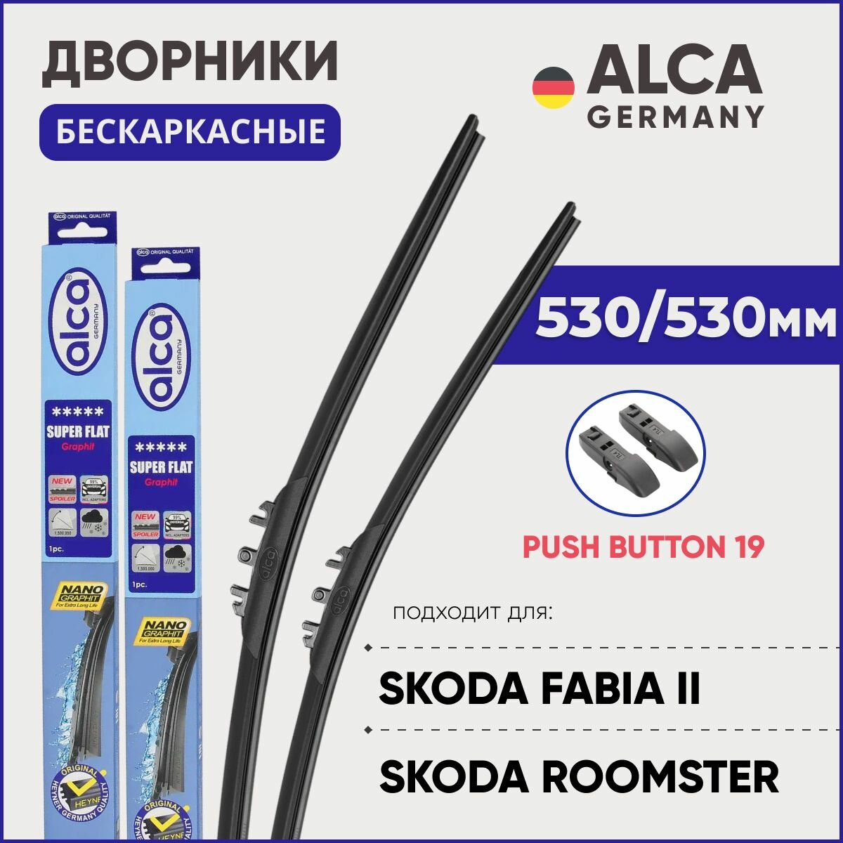 Стеклоочистители (дворники) Дворники для Skoda Fabia / Roomster 530/530 мм бескаркасные ALCA (Германия) с креплением Push Button 19 мм