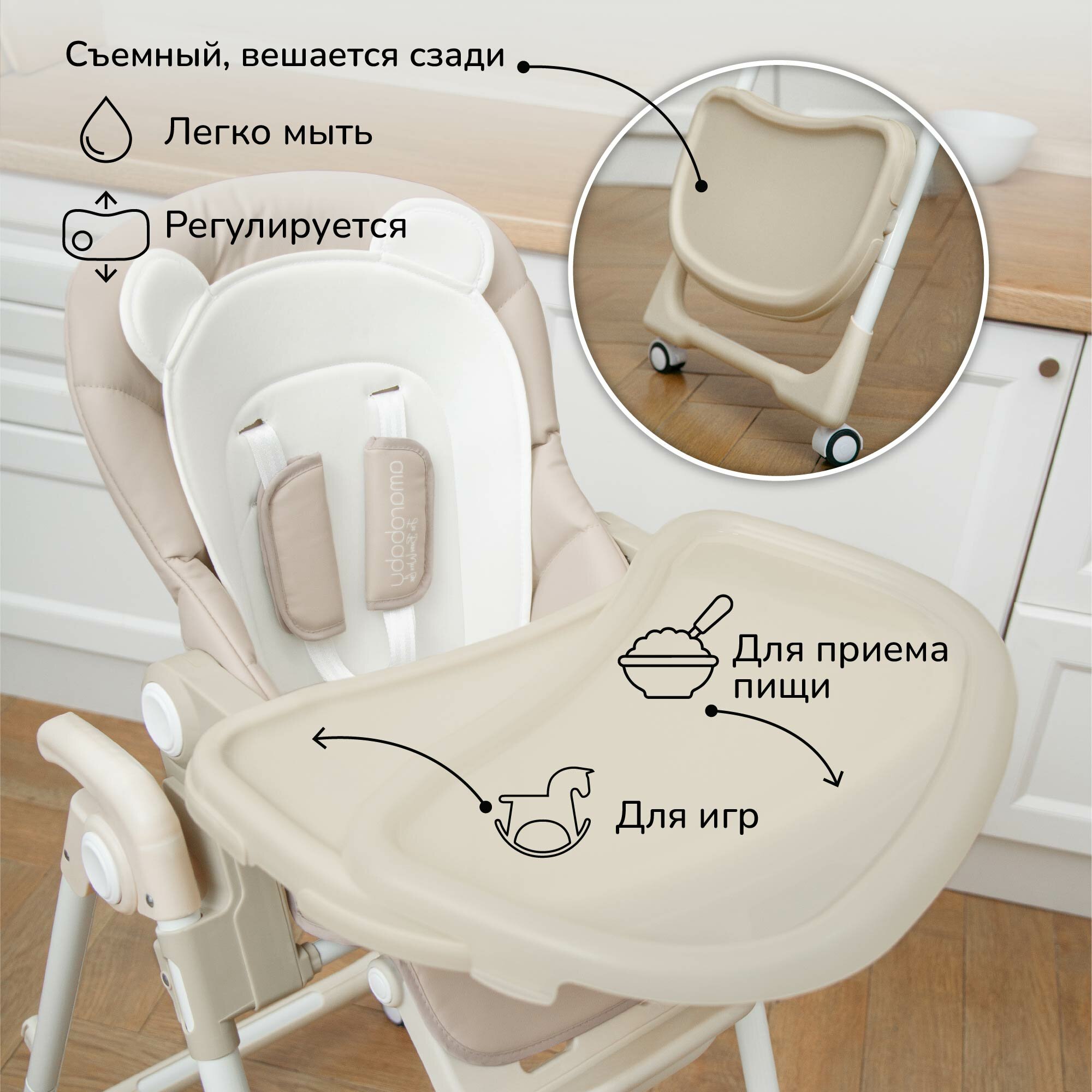 | Дополнительно | съемный столик / съемный поднос / столешница с бортиком / ремни безопасности / колеса с фиксаторами / корзина для игрушек / лежачее положение |