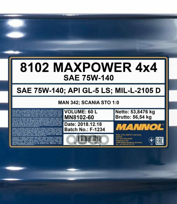 MANNOL MN8102-60 8102-60 MANNOL MAXPOWER 4x4 75W140 Синтетическое трансмиссионное масло 75W-140 60л 1шт