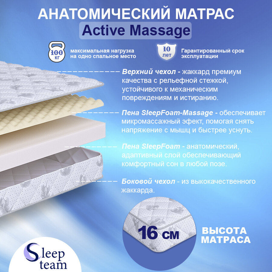 Матрас SleepTeam Active Massage 170х190, для кровати, высота 16 см, беспружинный с массажным эффектом, двуспальный 14 901 ₽ Подробнее