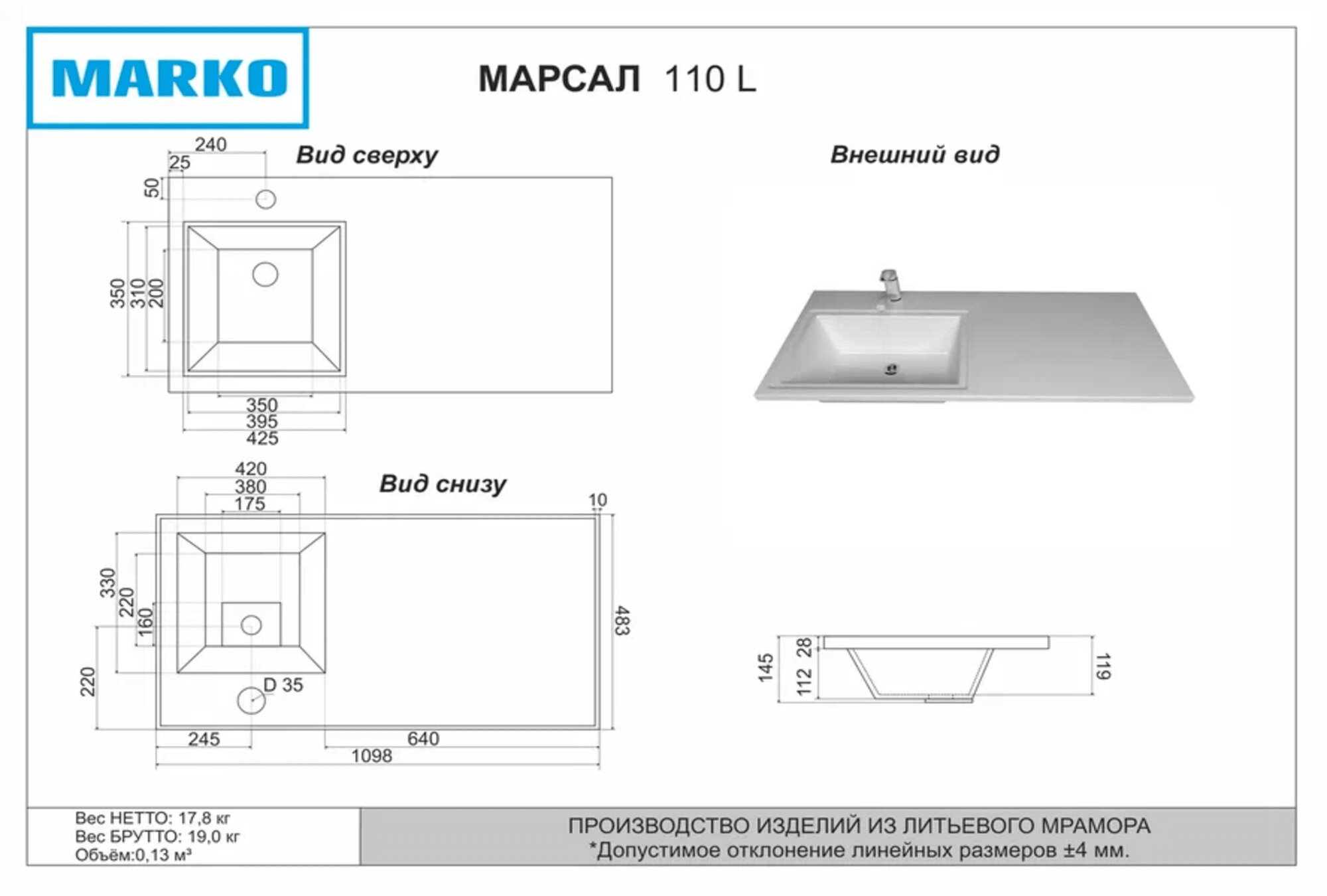| Отверстие под смеситель | + |