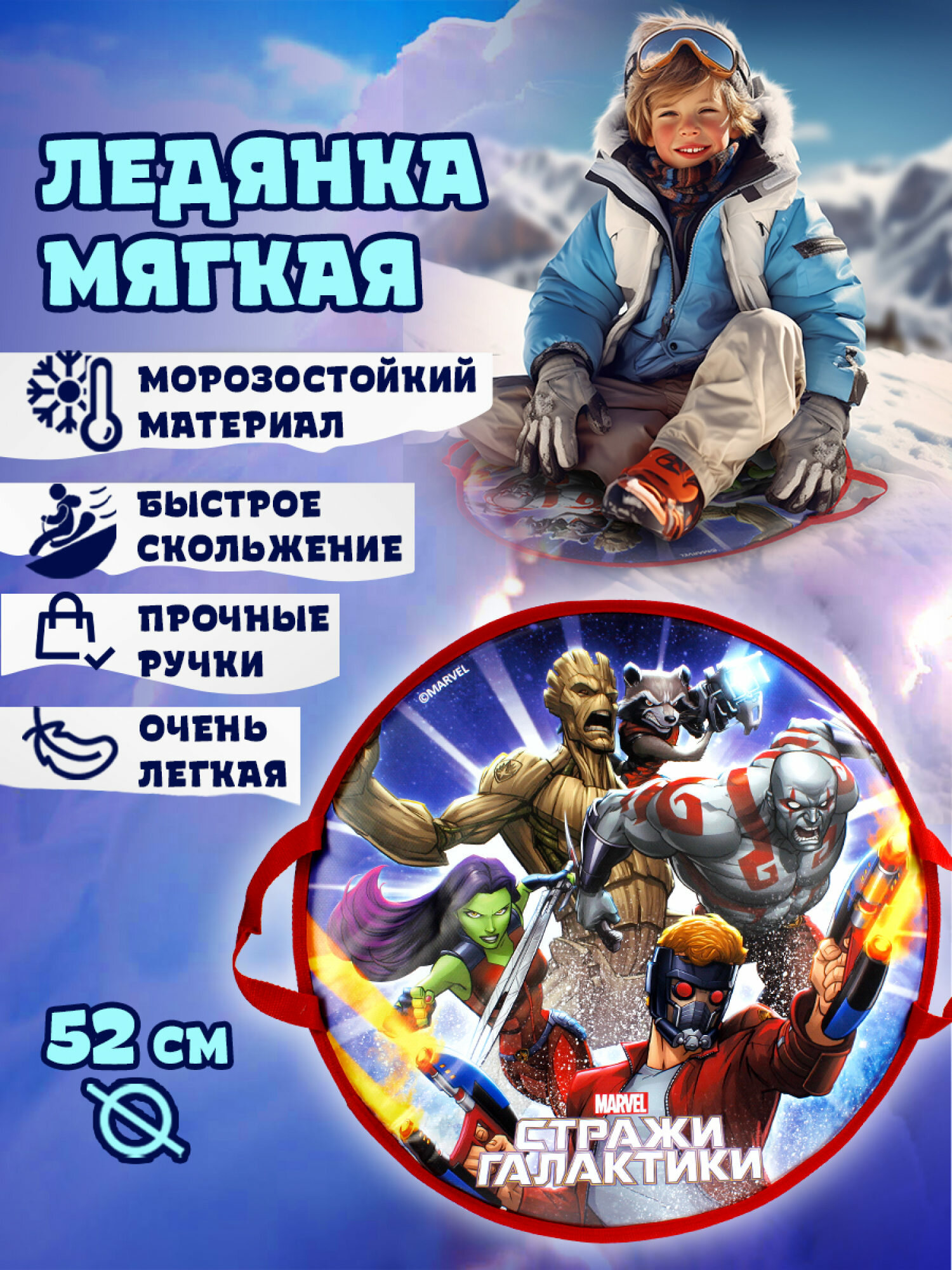 Лучшие цены. Ледянка для горки мягкая Marvel Стражи галактики — незаменимая вещь для зимних развлечений! Ледянка большая мягкая имеет форму круга и диаметр 52 см. Ледянка с ручками, поэтому ее удобно брать с собой и носить без каких-либо трудностей. Сами ручки хорошо пристрочены и закреплены. Мягкая ледянка для горки с ручкой и рисунком из легендарного мультика Стражи галактики придется по вкусу любому ребенку. Ледянка детская мягкая, удобная, приятная и легкая. Магазины в вашем городе.