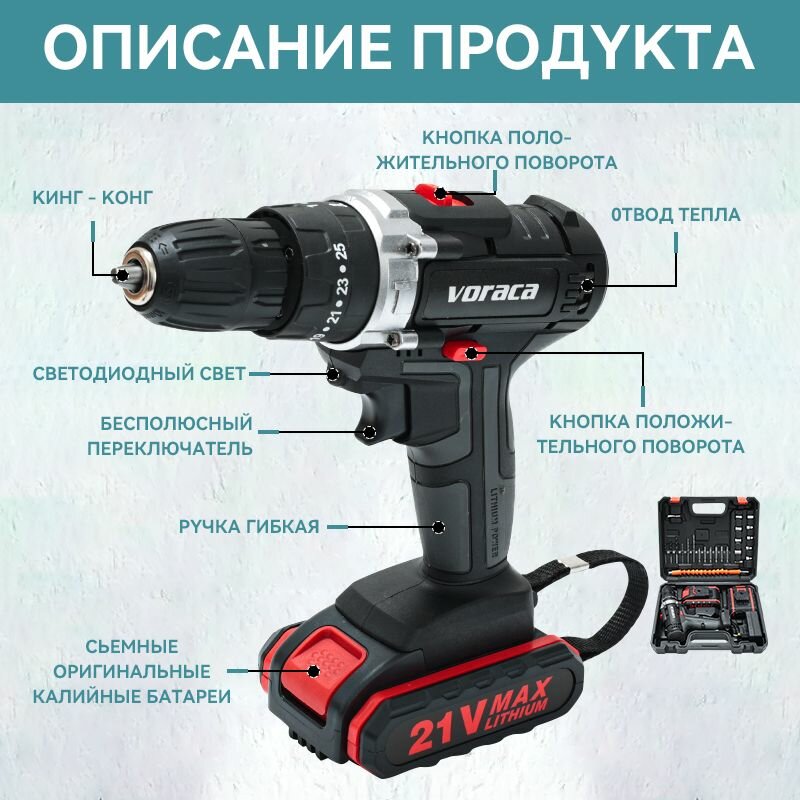 Дрели и шуруповерты Аккумуляторная отвертка/дрель/шуруповерт, набор инструментов, 21 В, 2 аккумулятора, 1 зарядное устройство и аксессуары