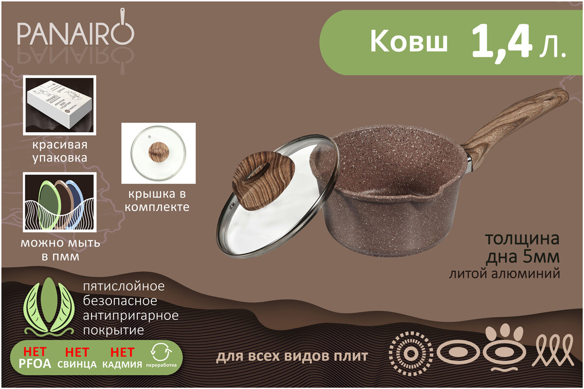 Лучшие цены. Ковш с крышкой Объем: 1.4 л Толщина стенок: 2.5 мм Толщина дна: 5 мм Материал: литой алюминий Цвет: терракотовый Серия: Barbara MAX Тип плиты: для всех типов, включая индукционные Внутреннее покрытие: 5-х слойное антипригарное, произведено способом напыления Крышка: стекло Ручка: бакелит с покрытием софт-тач Можно мыть в посудомоечной машине Особенности: Многофункциональный ковш объемом 1,4 л - незаменимый помощник на кухне. Магазины в вашем городе.