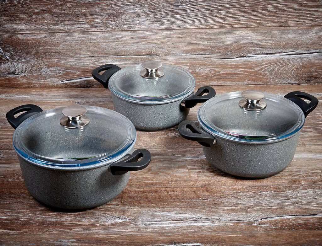 Лучшие цены. Кастрюля с крышкой Объем: 4 л Толщина борта: 4 мм Толщина дна: 6 мм Материал: литой алюминий Цвет: серый Серия: Mont Blanc Тип плиты: для всех типов, кроме индукционных Внутреннее покрытие: антипригарное Greblon C3 Крышка: стекло. Магазины в вашем городе.