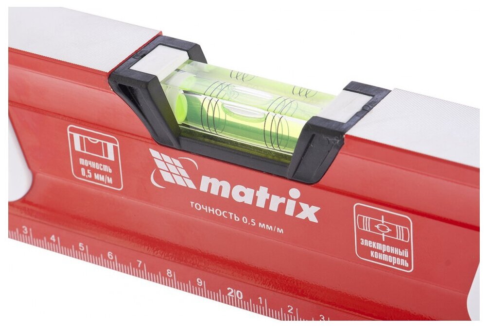 Лучшие цены. Тип: Уровень; Длина: 1.2м; Количество глазков: 3; Прогрешность: 0.5 мм/м; Магнитное основание: есть; Описание: Уровни строительные торговой марки "Matrix" изготовлены из алюминиевого сплава марки 6063 и предназначены для проверки вертикальных и горизонтальных поверхностей, а также поверхностей расположенных под углом 45 градусов., Использование электронного контроля при установке пузырьковых ампул обеспечивает надежность инструмента при эксплуатации., Точность уровня 0,5 мм/м., Дополнительное. Магазины в вашем городе.