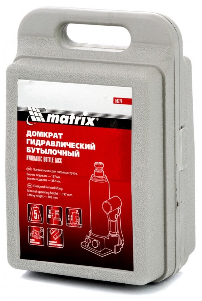 Домкрат гидравлический бутылочный Matrix 5 т, h 197–382 мм, в пласт. кейсе 50776