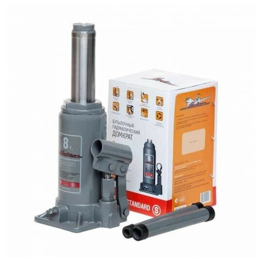 Лучшие цены. Домкрат бутылочный 8т S (MIN - 200 мм, MAX - 385 мм) Описание: Бутылочные домкраты обладают самыми компактными размерами и простейшей схемой функционирования. Занимает мало места и не требует особых знаний в использовании. Единственное требование – хранение и транспортировка в вертикальном положении. Бутылочные домкраты имеют самый широкий модельный ряд (от 2 до 32т), что делает их незаменимыми при необходимости поднять грузовик или автобус. В бутылочных домкратах серии STANDARD (индекс S). Магазины в вашем городе.