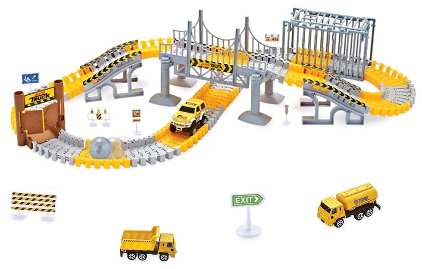 Автотрек / железная дорога Гибкий трек 1TOY "Стройплощадка"179 деталей(ворота, мост, туннель, , шарик, 3 машинки).
