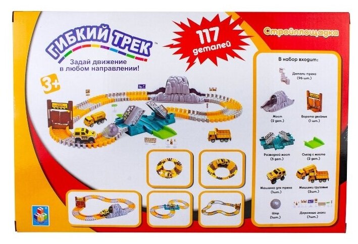 Лучшие цены. Наборы серии "Гибкий трек" задают новый тренд традиционной игре с машинками. Дорогу можно не просто собрать так, чтобы она поворачивала и петляла в разные стороны (благодаря специальным деталям-рельсам), но также сделать выпуклой или вогнутой или вообще "закольцевать", заставив машинку ехать внутри нее, словно хомячка внутри специального круга. В серии гибких треков "Стройплощадка" трасса яркого желто-оранжевого цвета, в набор входит джип и 2 дополнительные метал.машинки строительной. Магазины в вашем городе.