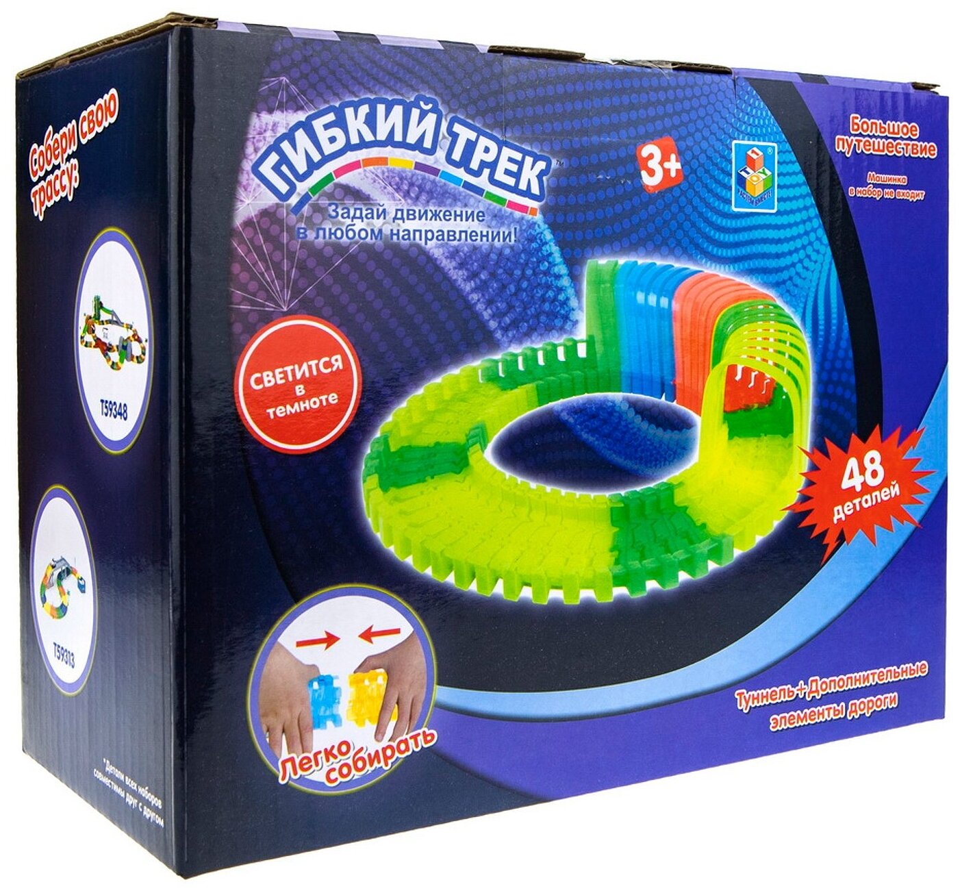 Автотрек / железная дорога Гибкий трек 1Toy "Туннель", 24 простых и 24 светящихся в темноте детали трека (Т13214)