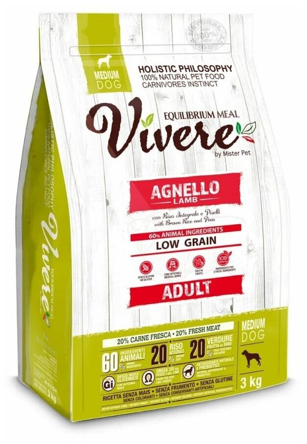 Сухой корм VIVERE LOW GRAIN ADULT MEDIUM LAMB низкозерновой для взрослых собак средних пород с ягненком (3 кг)