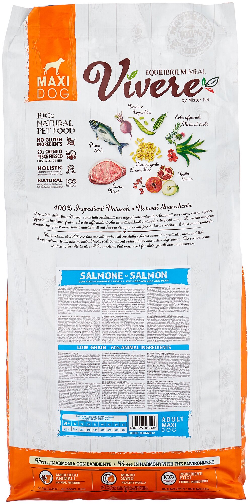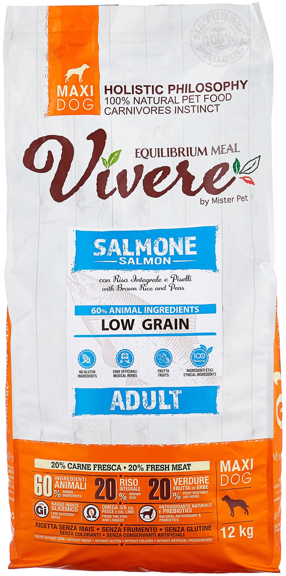 Сухой корм VIVERE LOW GRAIN ADULT MAXI SALMON низкозерновой для взрослых собак крупных пород с лососем (12 кг)