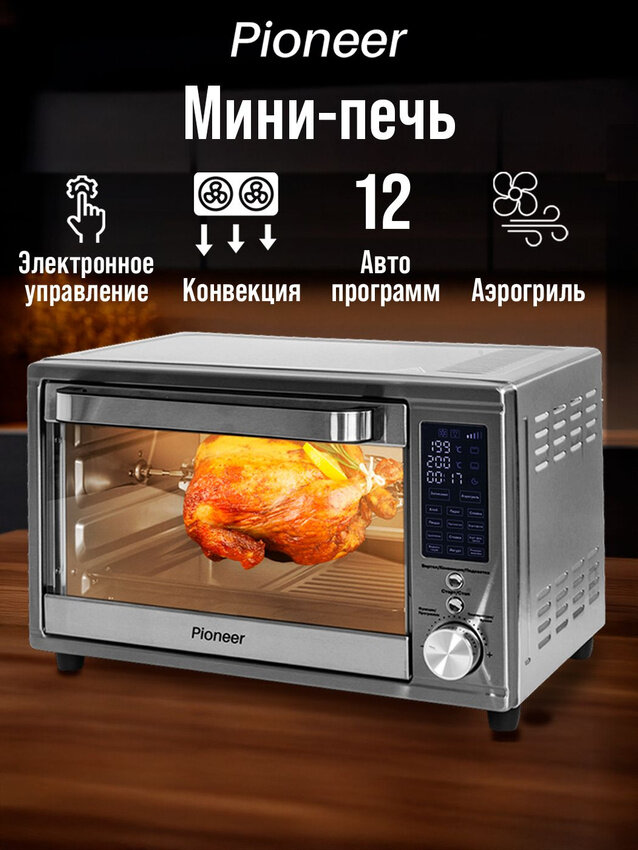 Электродуховки Мини-печь 30 л с конвекцией и аэрогрилем Pioneer MO5023G, 12 автопрограмм, таймер, 2 года гарантии, 1600 + 400 Вт