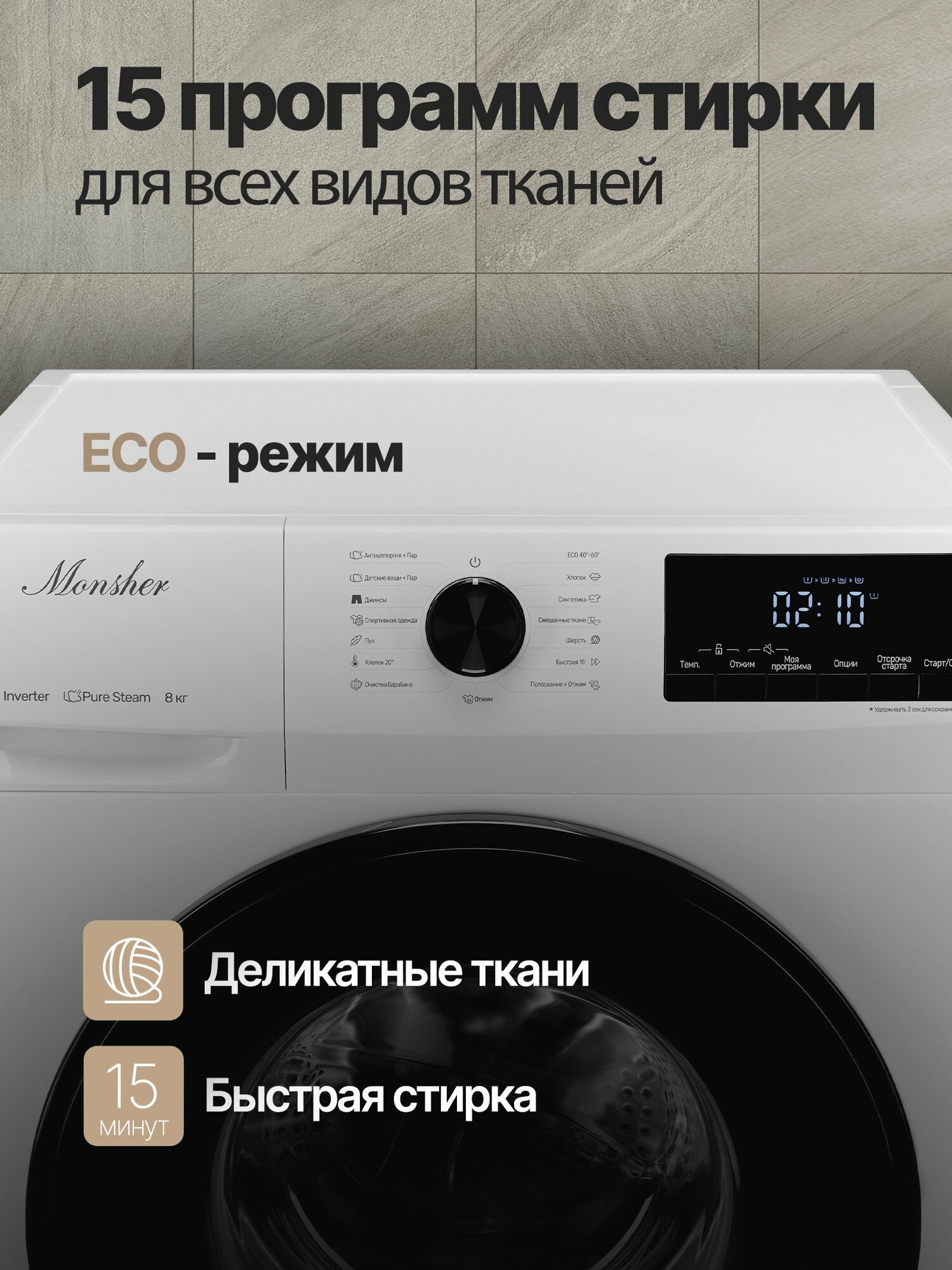 | Дополнительные программы | быстрая стирка / деликатная стирка / темная одежда / джинсовая одежда / верхняя одежда |