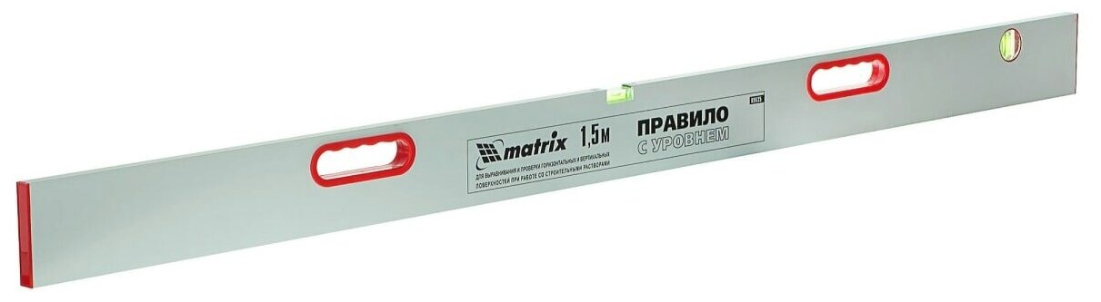 Лучшие цены. Алюминиевое правило с уровнем Matrix 89635, L-1,5 м, с 2 ручками, пригодится начинающим и опытным мастерам при работе со строительными смесями. Благодаря ему обеспечивается производительность, эффективность распределения и выравнивания растворов на горизонтальных/вертикальных поверхностях. Встроенный уровень повышает точность работы. Преимущества. Алюминий, из которого выполнено правило, обеспечивает его высокие эксплуатационные характеристики: прочность, надежность, стойкость к коррозии, легкость, простоту. Магазины в вашем городе.