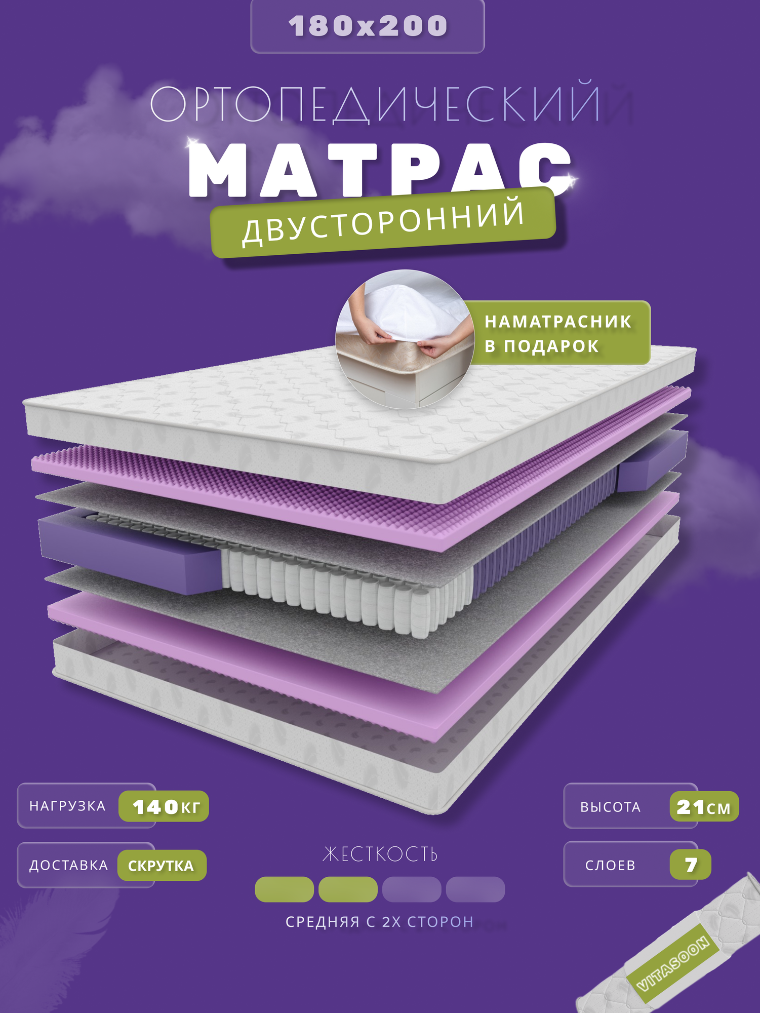 Матрасы Матрас ортопедический 180х200 см VitaSoon STRONG Ck, пружинный, двуспальный, анатомический, ППУ, средняя жесткость, в рулоне