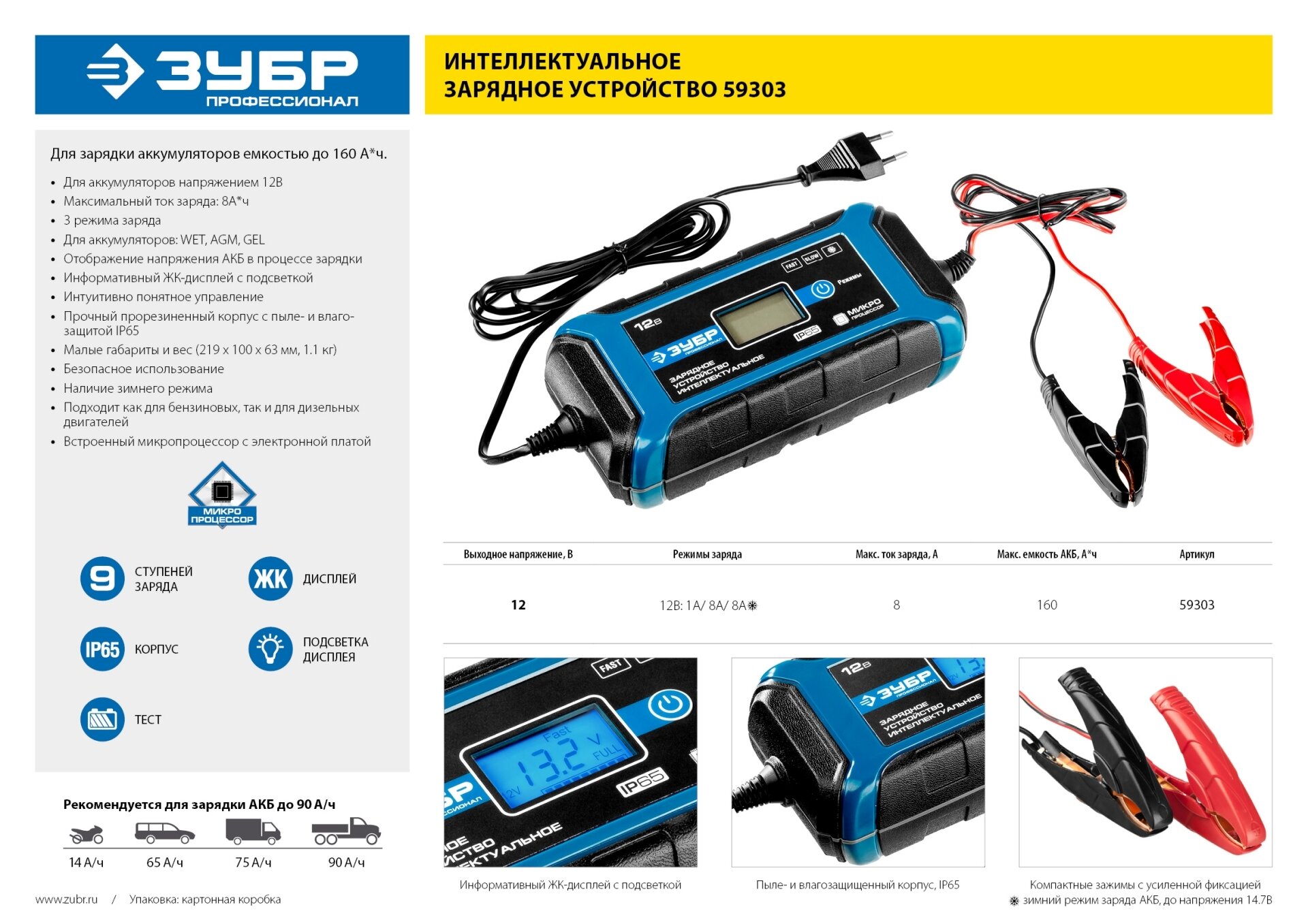 Лучшие цены. Микропроцессор зарядного устройства оценивает состояние батареи и соответствующим образом устанавливает силу зарядного тока и напряжение (в зависимости от типа АКБ и её состояния). Это позволяет наиболее эффективно зарядить аккумулятор и продлить срок его службы. Для аккумуляторов напряжением 12В, Max ток зарядки 8А, Тип заряжаемого аккумулятора WET/GEL/AGM, IP65 Описание Оборудование ЗУБР создано на основе современных материалов и передовых технологий. Магазины в вашем городе.