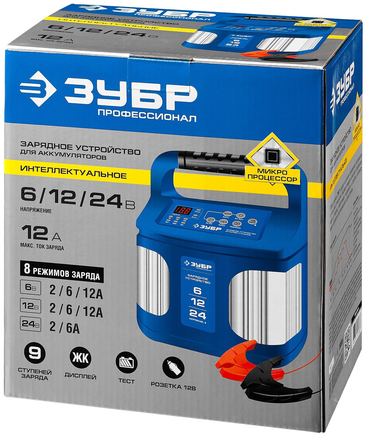 ЗУБР ЗУ-240, 6/12/24 В, 2-12 А, розетка 12 В, интеллектуальное зарядное устройство для аккумуляторов, Профессионал (59305)