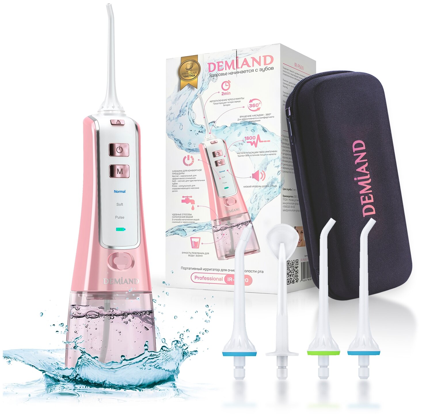Лучшие цены. Ирригатор Demiand Professional IR-P600 обеспечивает 1250–1800 пульсации в минуту и с помощью направленной струи воды эффективно и деликатно удаляет мягкий зубной налёт, очищает межзубное пространство, пришеечные области зуба и другие труднодоступные места полости рта от остатков пищи. Портативный ирригатор идеально подойдёт тем, кто часто ездит в командировки и путешествует. Компактная модель не занимает много места в ванной комнате. В конструкции нет шланга или провода. Магазины в вашем городе.