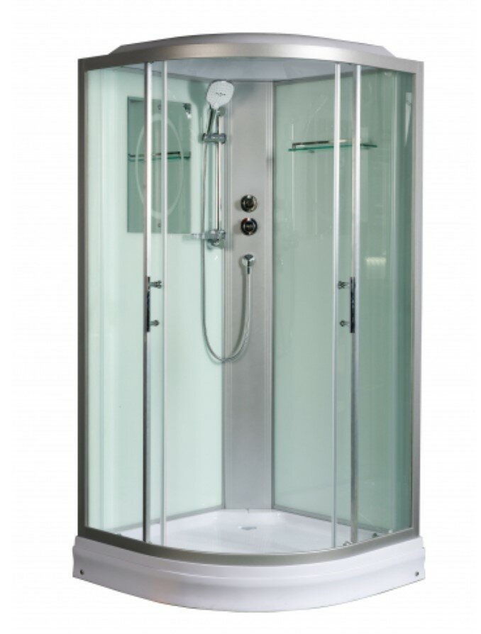 Лучшие цены. профиль анодированный алюминий Фурнитура вся металл хром смеситель латунный с резьбовыми выходами верхний металлический душ с системой Easy Clean длина шланга 1500-1900 мм. Шланг растягивается полочка с металлическим ограничителем зеркало с фацетом и декоративной рамкой ручки металл хром двойные верхние металлические ролики сифон с гидрозатвором резьбовое соединение всех задних шлангов. Магазины в вашем городе.