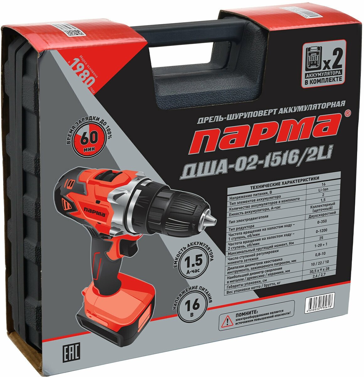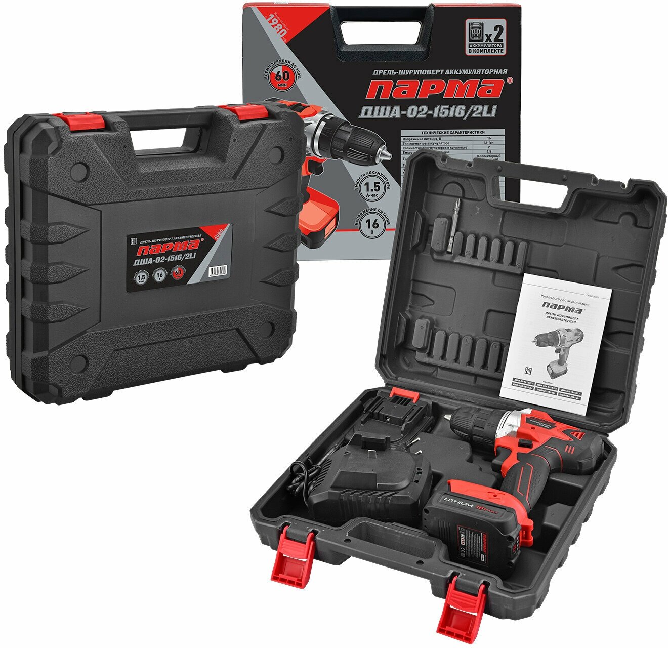Дрель/шуруповерт Парма ДША-02-1516/2Li, Шуруповерт (16В, 1,5Ач, 2аккумулятора, 2скорости, подсветка индикатора, кейс)