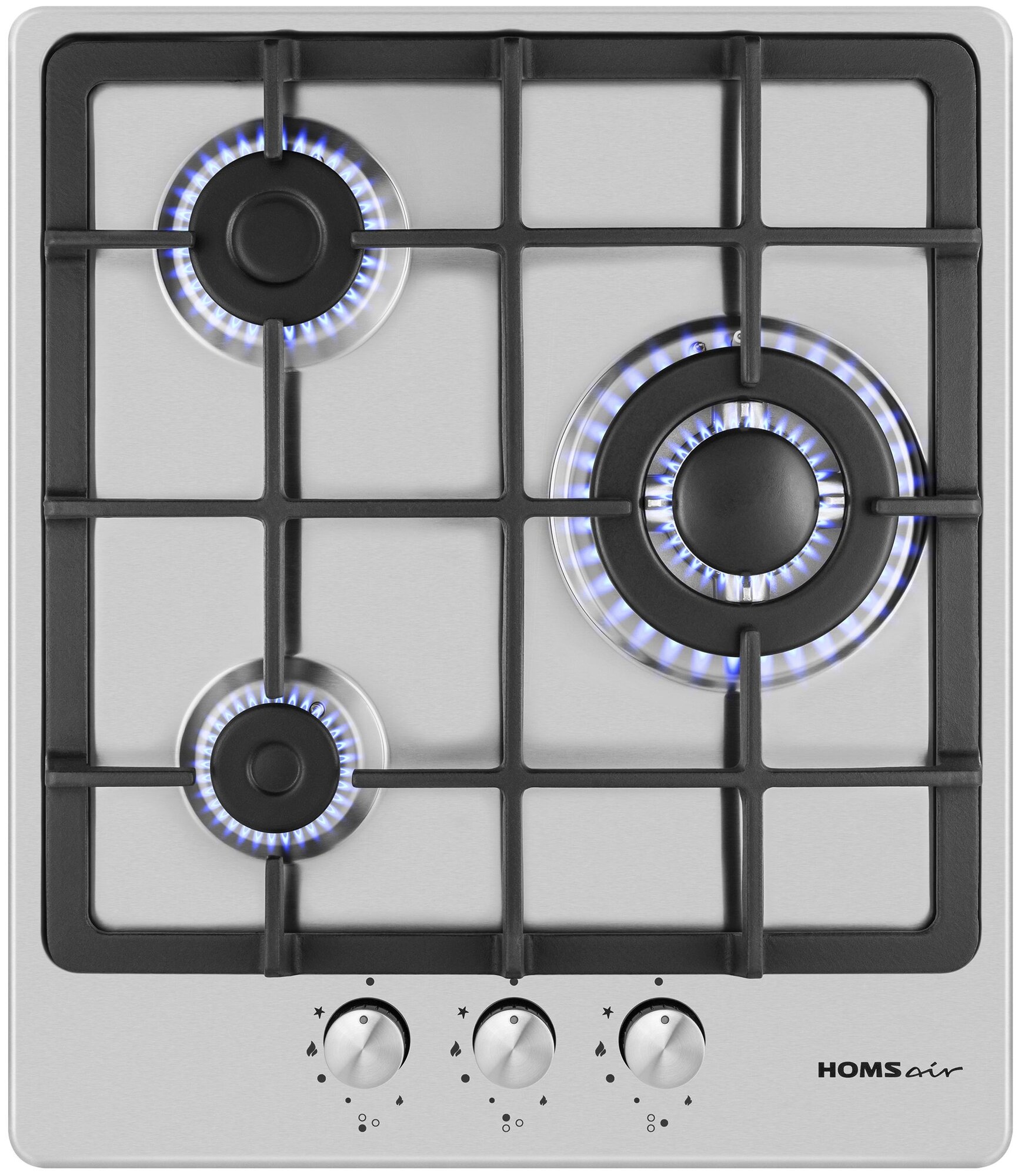 Лучшие цены. В каждый переключатель газовой варочной поверхности HOMSair HGS433TGCS интегрирована система электроподжига газа в соответствующей конфорке, которая срабатывает при нажатии на переключатель. Газ-контроль эффективно предотвращает связанные с утечками газа аварийные ситуации: если пламя в конфорке потухнет, подача газа немедленно прекратится. Магазины в вашем городе.