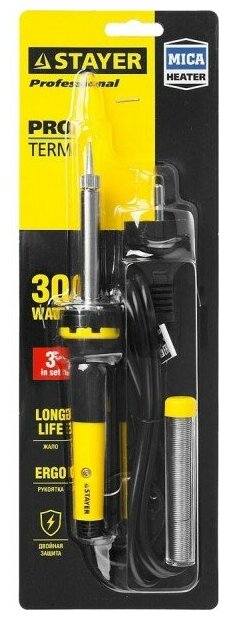 Паяльник с двухкомпонентной рукояткой и долговечным жалом, STAYER "PROFI" PROTerm, 55300-30, в комплекте (припой и подст электротовар