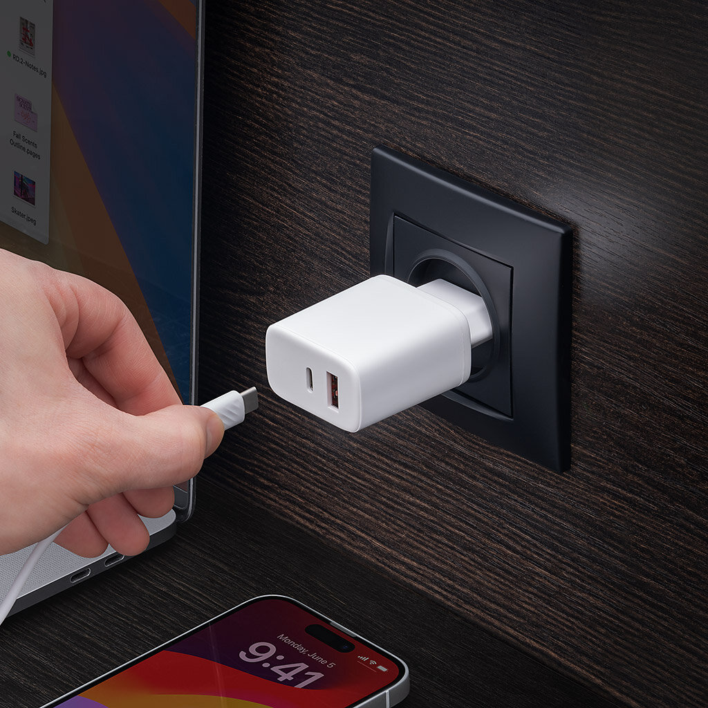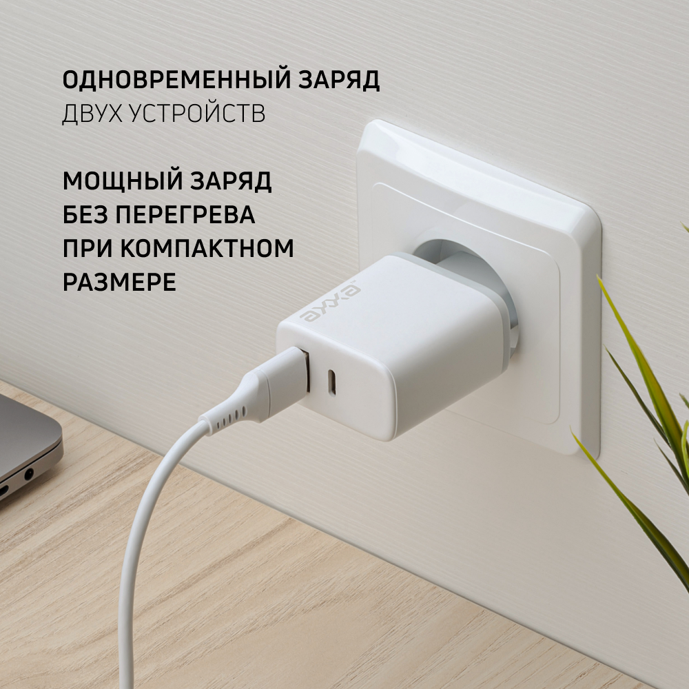 Зарядки для гаджетов Сетевое зарядное устройство USB-A + Type-C, PD, QC 3.0, 20Вт, белый, AXXA 2404