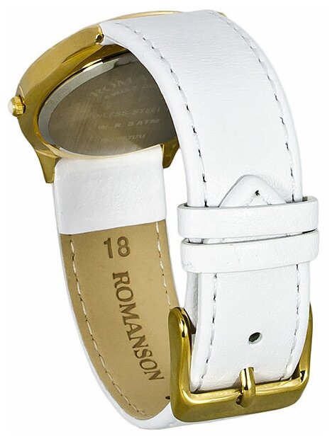 Лучшие цены. Женские наручные часы Romanson RL0367UUG(WH). Общие характеристики. Тип: кварцевые, женские. Способ отображения времени: аналоговый (стрелки), формат 12 часов. Цифры: арабские. Источник энергии: от батарейки. Конструкция. Водонепроницаемые: есть, WR30 (3 атм). Материал корпуса: латунь. Материал браслета/ремешка: кожа. Стекло: минеральное. Магазины в вашем городе.