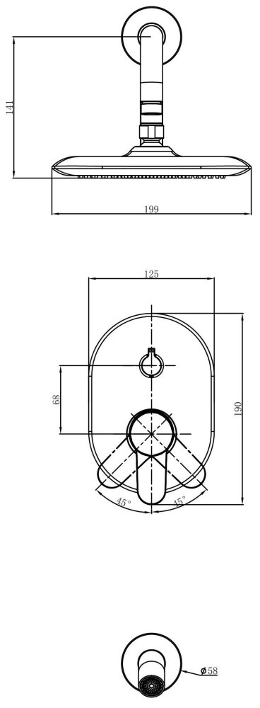 | Комплектация | верхний душ (тропический) / смеситель / излив / настенный кронштейн |