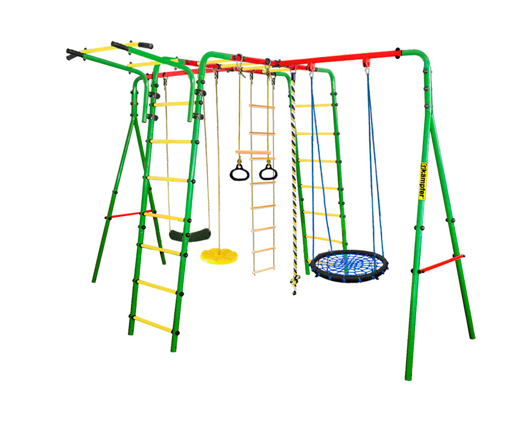 Лучшие цены. Уличный детский спортивный комплекс Kampfer Wunder это новая прочная конструкция, рекомендованная для установки на детских игровых площадках, дачных и приусадебных участках. Состав модели: — Две А-образных опоры каждая состоит из 2-х металлических стоек — Две перекладины для навесного оборудования — П-образная опора из 2-х металлических шведских стенок и лаза-рукохода — передвижной турник Комплектация: — кольца с перекладиной — канат — веревочная лестница — гибкие пластиковые качели — круглые пластиковые. Магазины в вашем городе.