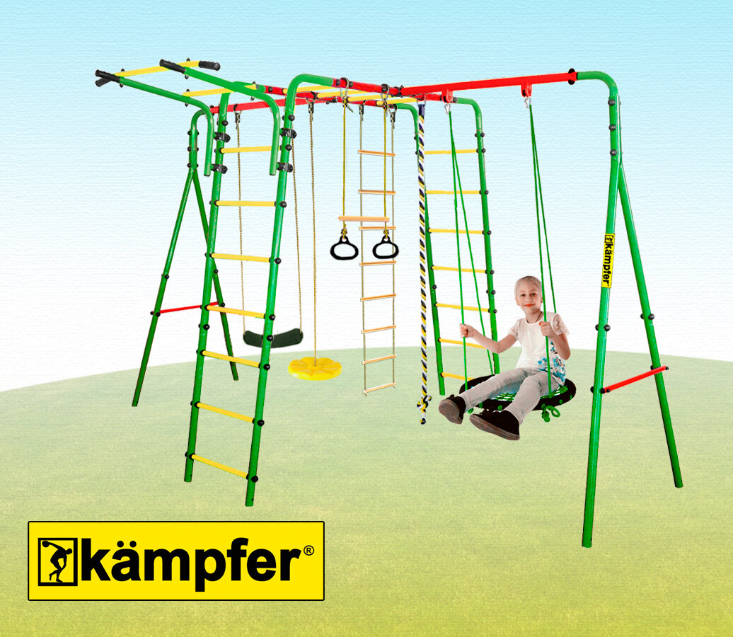 Лучшие цены. Уличный детский спортивный комплекс Kampfer Wunder это новая прочная конструкция, рекомендованная для установки на детских игровых площадках, дачных и приусадебных участках. Состав модели: — Две А-образных опоры каждая состоит из 2-х металлических стоек — Две перекладины для навесного оборудования — П-образная опора из 2-х металлических шведских стенок и лаза-рукохода — передвижной турник Комплектация: — кольца с перекладиной — канат — веревочная лестница — гибкие пластиковые качели — круглые пластиковые. Магазины в вашем городе.