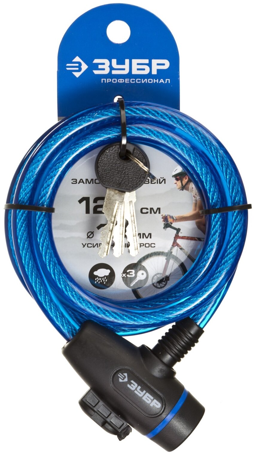 Велозамок / блокиратор Замок Зубр ""Профессионал"", тросовый, 3 ключа в комплекте, длина троса 1200мм, d 10мм .