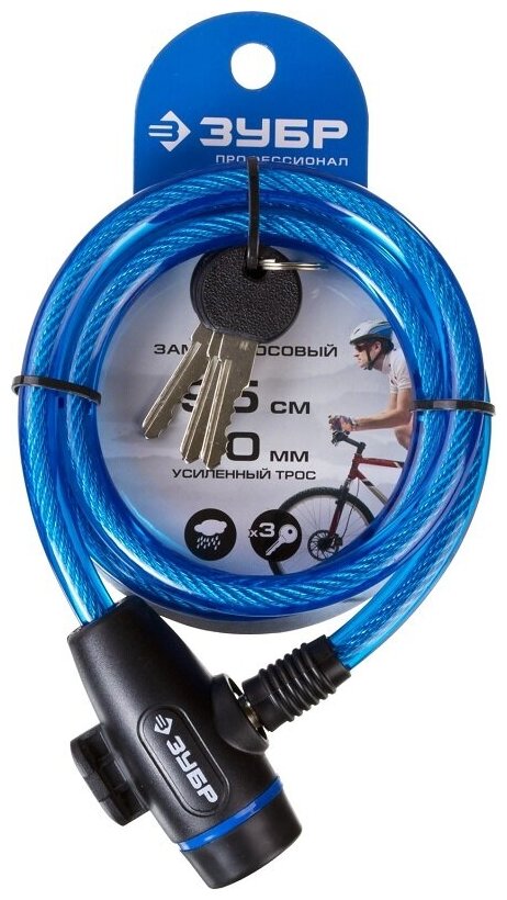 Велозамок / блокиратор Замок Зубр ""Профессионал"", тросовый, 3 ключа в комплекте, длина троса 950мм, d 10мм .