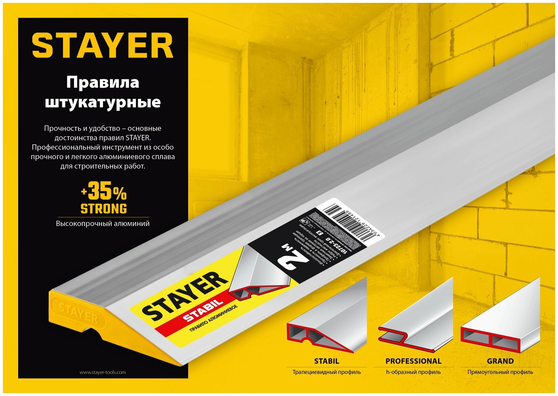 STAYER Правило-уровень алюминиевый, 2 глазка, 2 ручки, 3м усилен прямоуг профиль, с ребром STAYER "PROFI"