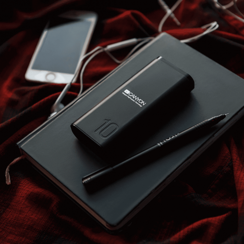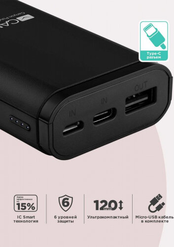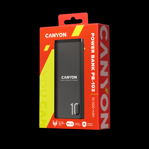 Внешний аккумулятор Canyon PB-103 с дополнительным Type-C входом 10000 мАч IN 5V / 2A Micro USB/Type-C) OUT 5V-21A USB) Smart IC черный