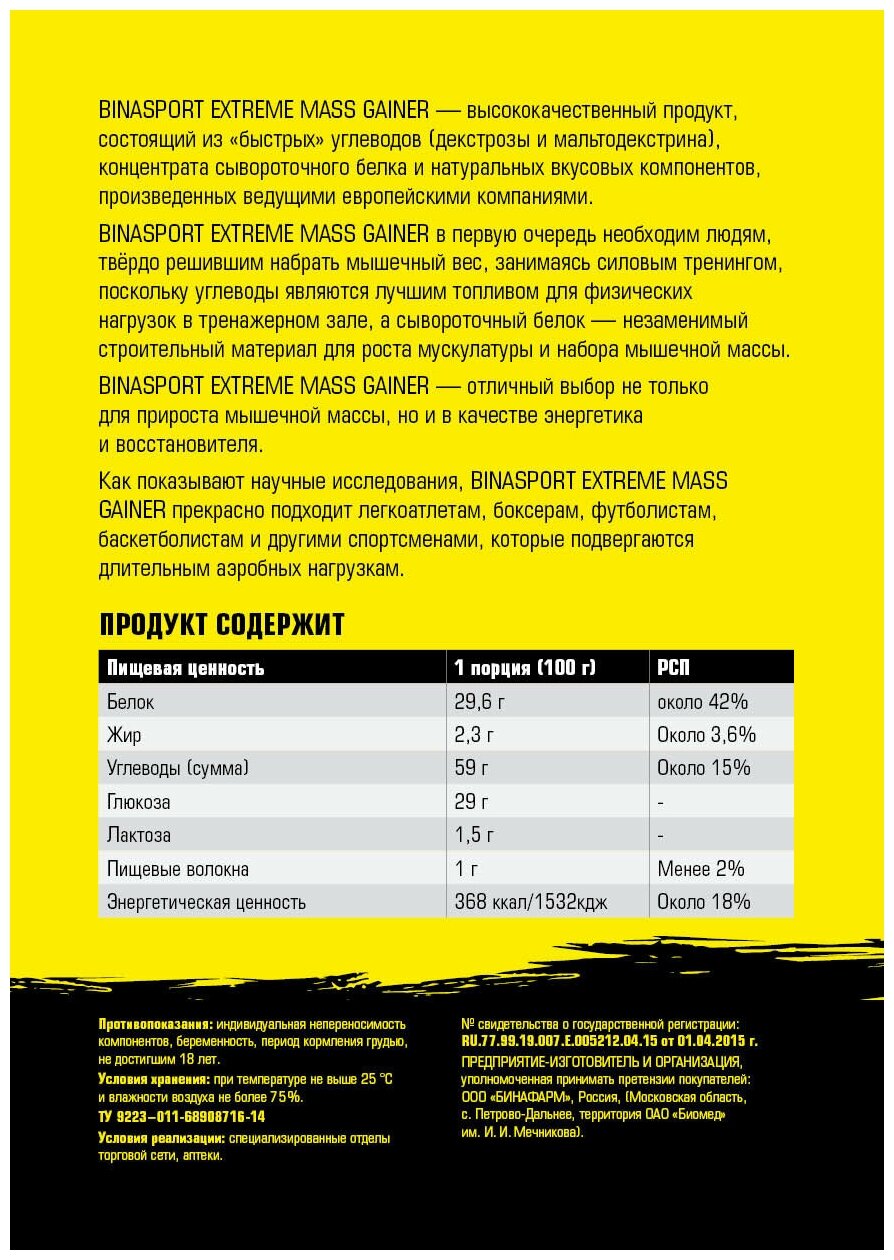 Лучшие цены. BINASPORT EXTREME MASS GAINER (Бинаспорт Экстрим Масс Гейнер) – высококачественный продукт, состоящий из «быстрых» углеводов (декстрозы и мальтодекстрина), концентрата сывороточного белка и натуральных вкусовых компонентов, произведенных ведущими европейскими компаниями. BINASPORT EXTREME MASS GAINER (Бинаспорт Экстрим Масс Гейнер) в первую очередь необходим людям, твёрдо решившим набрать мышечный вес, занимаясь силовым тренингом, поскольку углеводы являются лучшим топливом для физических нагрузок в. Магазины в вашем городе.