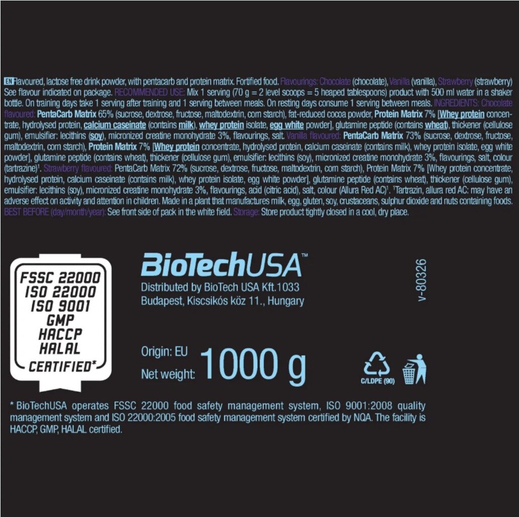 Лучшие цены. Muscle Mass от BioTechUSA может обеспечить поступление дополнительного количества калорий благодаря высокому содержанию углеводов. PentaCarb Matrix состоит из углеводов из 5 разных источников: он содержит компоненты с высоким гликемическим индексом, которые помогают быстрее всасывать белки и пополняют запас гликогена, тогда как компоненты с более низким гликемическим индексом обеспечивают организм энергией в долгосрочной перспективе из-за их более медленного поглощения. Магазины в вашем городе.