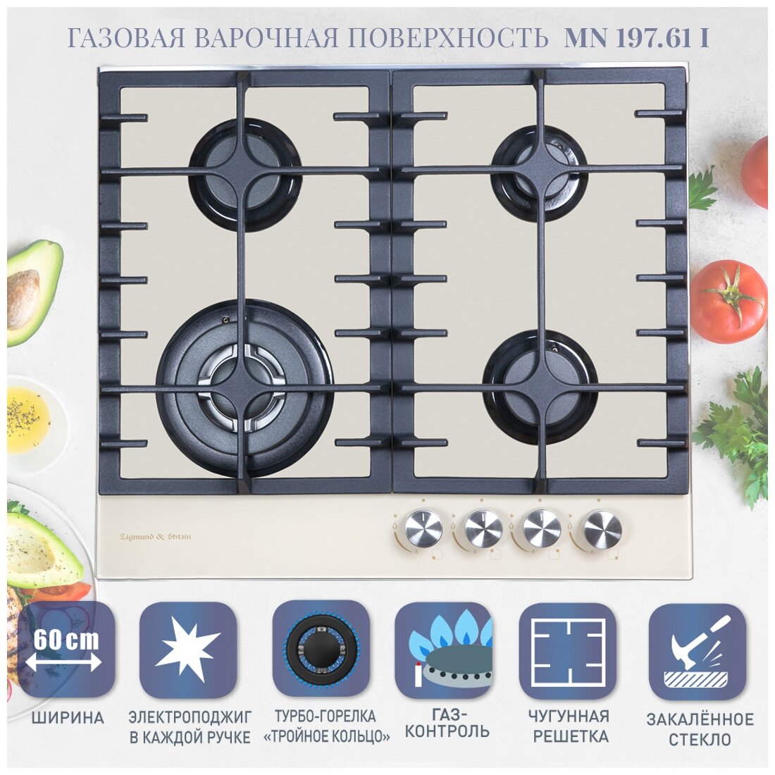 Лучшие цены. Газовая варочная панель Zigmund & Shtain MN 197.61 I Особенности: Рабочий стол: закалённое стекло Фронтальное управление Поворотные переключатели Тройное кольцо пламени Электроподжиг в каждой ручке Газ-контроль Чугунные решетки Матовые колпачки горелок Переходники для разных типов газа в комплекте Характеристики: 1 WOK-конфорка: 3400 Вт 2 конфорки: 1880 Вт 1 конфорка: 950 Вт Габариты (ШхГ). Магазины в вашем городе.