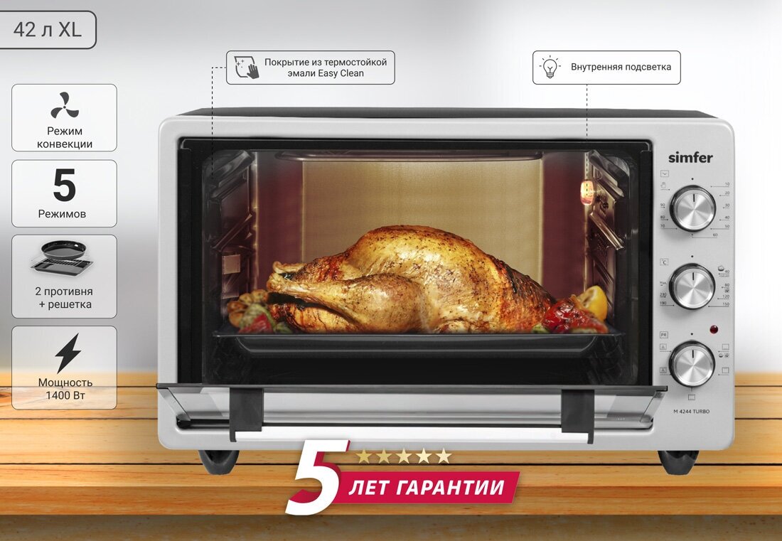 Лучшие цены. Электрическая мини-печь Simfer M4244 представляет собой ростер с пять рабочими режимами готовки и подогрева пищи. Настольная духовка предоставляет владельцу немало преимуществ. Первым из них выступают компактные размеры электропечи, которая весит всего 10,8 кг при следующих габаритах: 51,5*36*39 см. Объем внутренний камеры равняется традиционным для моделей из серии Albeni Plus 42 литрам. Магазины в вашем городе.
