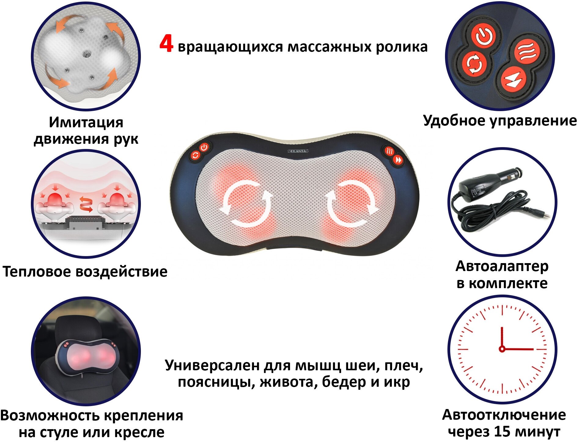 Лучшие цены. Массажная подушка МР-020 – это многофункциональная массажная подушка для дома и для автомобиля. Благодаря более мощному мотору 24 Вт и массажным роликам Шиацу с функцией подогрева подушку можно использовать на любых частях тела для глубокого разминания мышц и снятия напряжения. Точный эффект массажа Шиацу достигается благодаря четырем вращающимся головкам, встроенным в механизм подушки. Магазины в вашем городе.