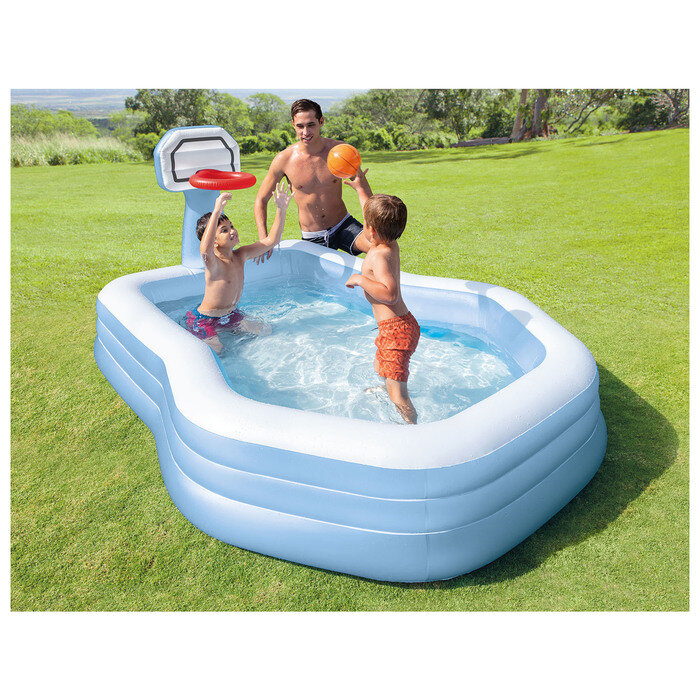 Лучшие цены. Семейный надувной бассейн с баскетбольным кольцом для игр очень большой и глубокий. Прямоугольный и очень просторный бассейн оснащён мягкими бортами и обеспечивают комфорт и безопасность. Такой бассейн отлично подойдёт для интересного и активного отдыха. Материал бассейна — прочный винил.Характеристики:высота бортика: 32 см;встроенное баскетбольное кольцо + надувной мяч;объем: 682 л;возраст: от 3 лет. Магазины в вашем городе.