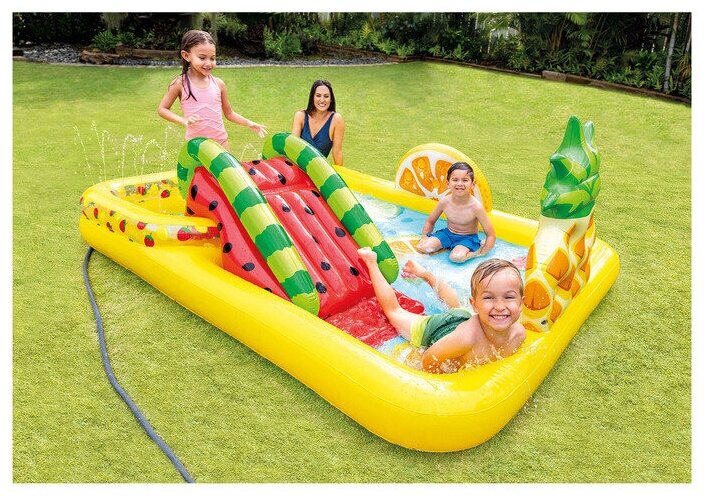 Лучшие цены. Надувной игровой комплекс Фруктовое удовольствие для детей от 2 лет состоит из двух бассейнов. Первый - мини-бассейн - лягушатник для самых маленьких, который заполняется водой на 11 см. Другой бассейн с уровнем воды в 20 см предназначен для детей постарше. Из маленького бассейна в большой можно скатиться по надувной горке - любимой забаве всех малышей. А смягчит приземление надувная подушечка у основания. Игровой комплекс украшает надувной ананас. Магазины в вашем городе.