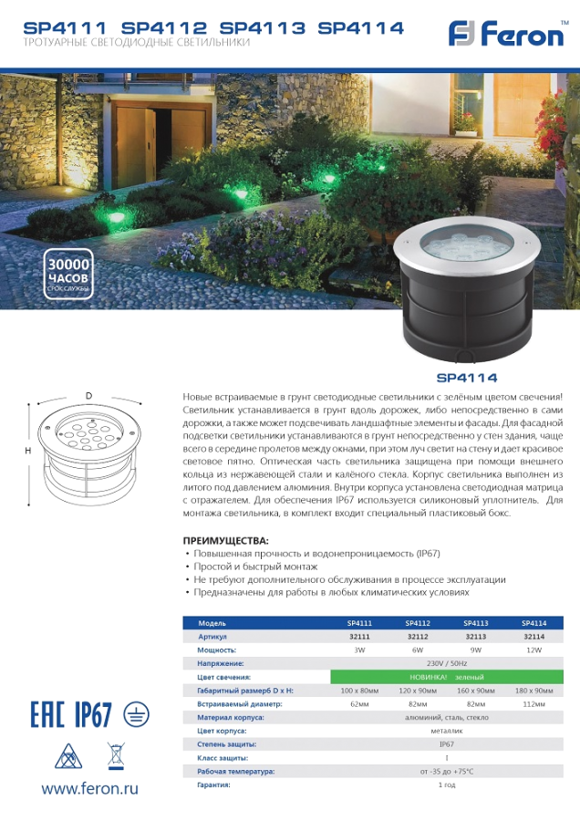 Лучшие цены. Тротуарный светильник светодиодный, встраиваемый (ДВУ) FERON SP4114, 12W, (зеленый), 230V/50Гц, IP67, угол рассеивания 24°, 12LED*HPL, класс защиты 1, раб.t -35°C - +75°C, цвет металлик, корпус алюминий, сталь, 180*180*85мм, D внутр. Магазины в вашем городе.