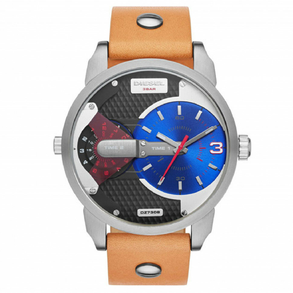 Лучшие цены. Мужские наручные часы Diesel DZ7308 кварцевые, приводящиеся в действие с помощью батарейки. Корпус стальной с черным с синим циферблатом и минеральным стеклом, устойчивым к ударам, браслет - кожаный ремешок. Модель Diesel DZ7308 обладает степенью влагостойкости 30 м (3 АТМ), где допустимы попадания брызг от мытья рук или дождя, для плавания рассмотрите варианты от 100 м (10 АТМ). Циферблат подсвечивается люминесцентной подсветкой, которая накапливает световой элемент при свете и светится в темноте. Магазины в вашем городе.