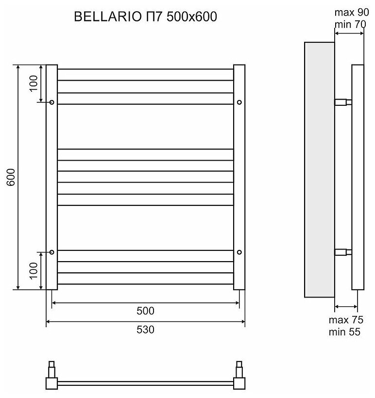 Лучшие цены. Высота: 60 см; Межосевое расстояние: 50 см; Ширина: 53.2 см; Количество перекладин: 7; Коллекция: Bellario; Тип: водяной; Форма: лесенка; Направление подключения: нижнее; С боковым подключением: нет; Глубина: 9 см; Монтажное подключение: 1/2 дюйма; Резьба подключения: внутренняя; Группировка перекладин: да; Поворотный: нет; Полка в комплекте: нет; Материал: нержавеющая сталь; Подключение: к системе горячего водоснабжения; Монтаж: подвесной; Цвет: черный; Гарантия на полотенцесушитель: 180 мес; Страна. Магазины в вашем городе.